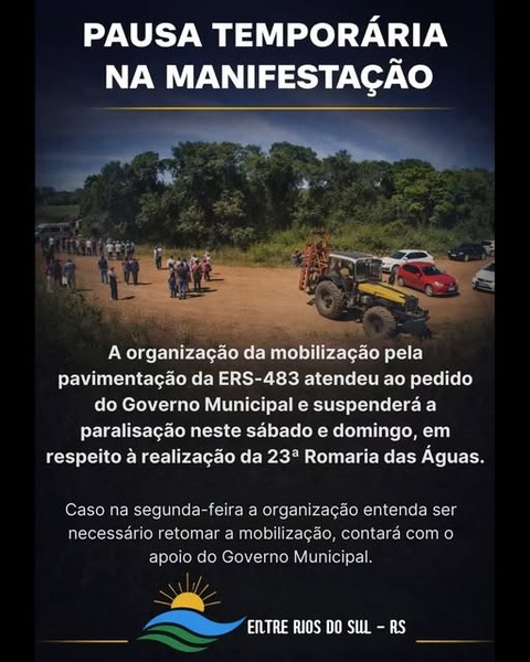 O vice-prefeito Rodrigo Oliboni também destacou que a mobilização busca dar agilidade ao processo de pavimentação da ERS-483, uma obra aguardada pela população há mais de cinco décadas. Segundo ele, o movimento é pacífico e organizado pelas entidades locais, com o objetivo de sensibilizar as lideranças políticas para que a obra finalmente saia do papel.