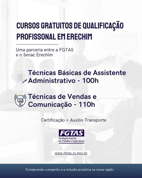 A Fundação Gaúcha do Trabalho e Ação Social (FGTAS), vinculada à Secretaria de Trabalho e Desenvolvimento Profissional do Governo do Estado, abriu inscrições para cursos gratuitos de qualificação profissional em Erechim, por meio do Programa Qualifica Brasil, do Ministério do Trabalho e Emprego (MTE).