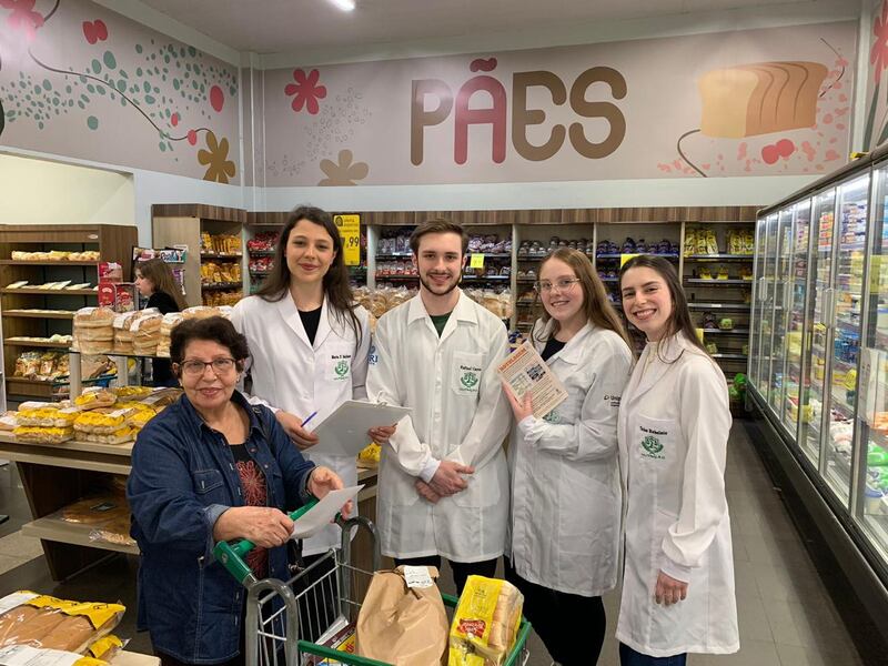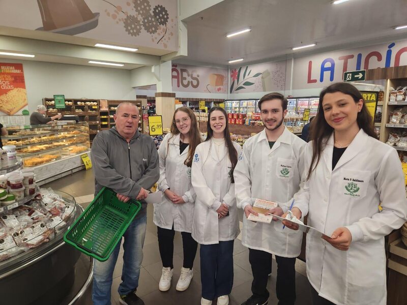 Estudantes do Curso de Nutrição da URI Erechim desenvolveram, em setembro, atividades de extensão voltadas à educação nutricional. A primeira ação ocorreu no dia 12, no Supermercado Caitá, com foco na leitura e compreensão dos rótulos dos alimentos. A iniciativa buscou apresentar aos consumidores como as informações dos produtos podem auxiliar em escolhas alimentares mais saudáveis.