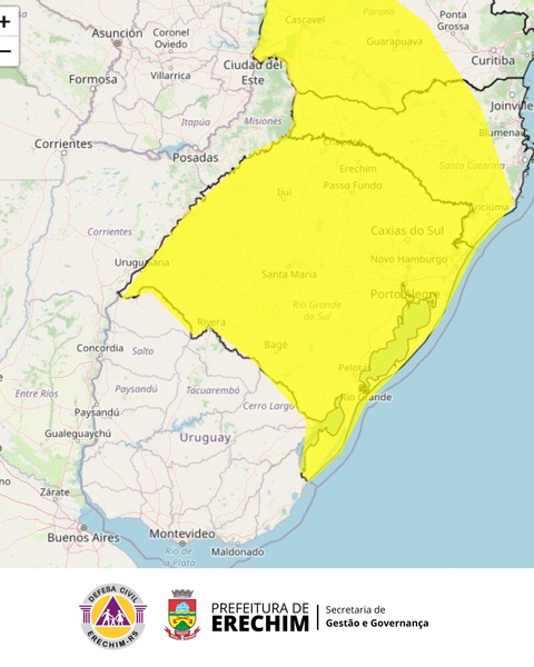 Defesa Civil de Erechim emite alerta amarelo com risco de granizo, chuva moderada e vento.