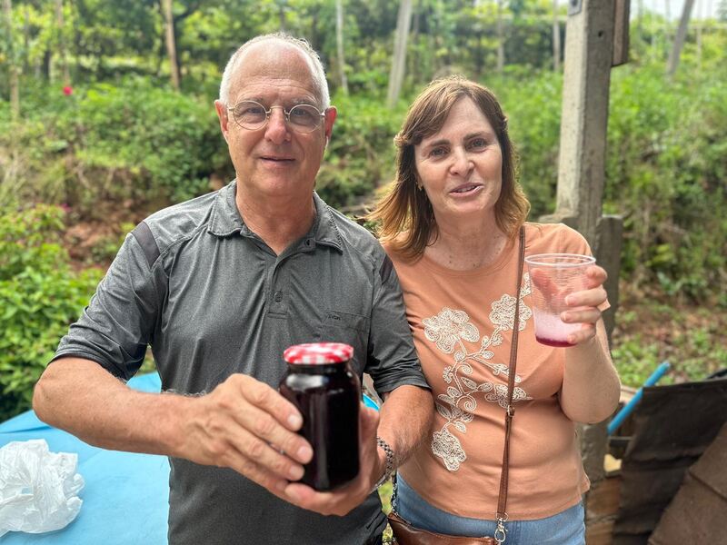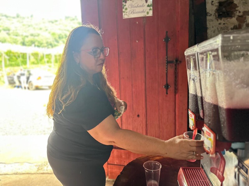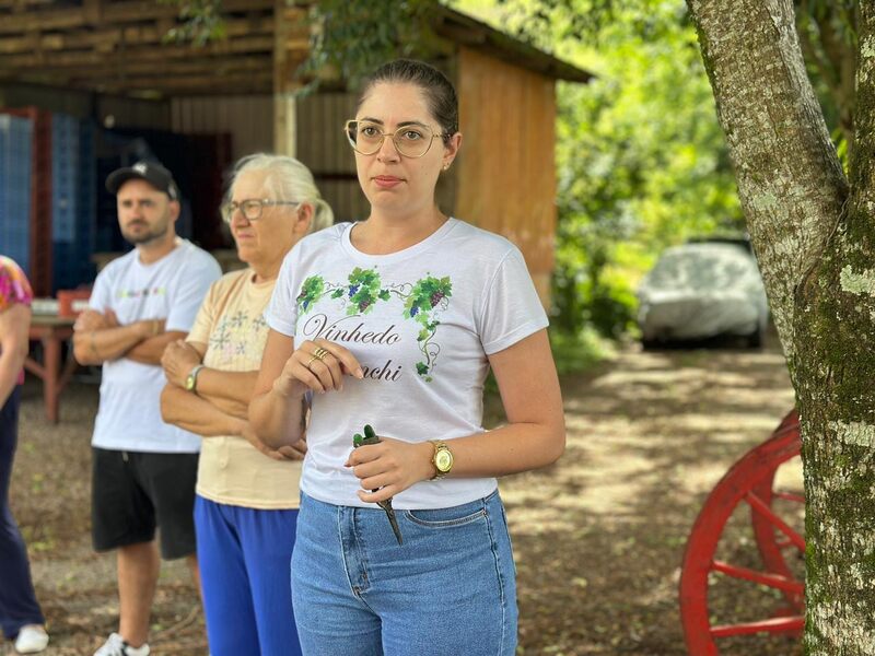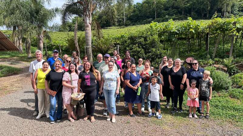 No vinhedo, o grupo caminhou entre os parreirais de uva, conheceu de perto o cultivo e degustou a fruta colhida diretamente do pé. A experiência seguiu com a degustação de produtos artesanais derivados da uva, como suco, vinho doce, graspa artesanal, geleias e cuca, com a possibilidade de adquirir os produtos para levar para casa.