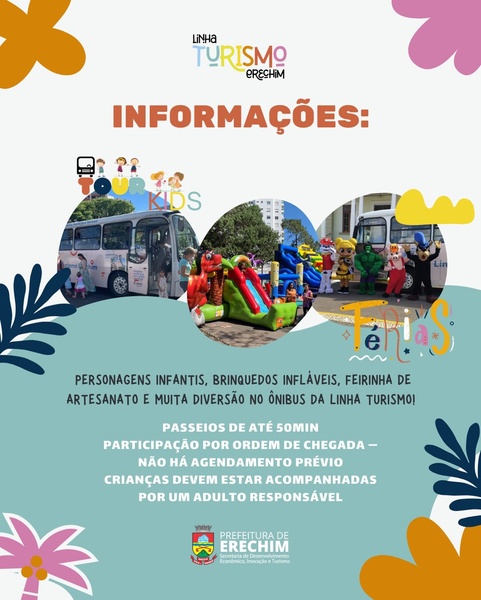 No dia 25 de janeiro, das 14h às 18h, a Linha Turismo Erechim convida os pequenos para curtir as férias do jeito mais divertido possível, com embarque na Praça Prefeito Jayme Lago o Tour Kids inclui brinquedos infláveis, feirinha do artesanato e muito mais.