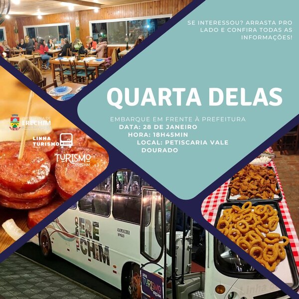Quarta Delas: No dia 28 de janeiro, o roteiro leva você até a Petiscaria Vale Dourado, com saída em frente à Prefeitura, em uma noite pensada para circular, conhecer e apoiar o turismo local de forma leve e prazerosa.