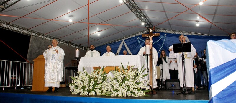 A procissão e a missa das 19h30 foram presididas pelo Pe. José Carlos Sala, Reitor do Seminário e Santuário de Fátima, com animação do Pe. Clair Favreto, Pároco da Catedral São José e equipe central de canto e instrumentistas. Concelebraram também os padres Isalino Rodrigues e Lucas André Stein. A celebração teve a participação do diácono permanente Jandir Casagrande, de muitos ministros, coroinhas e acólitos e grande número de outros devotos de Maria.