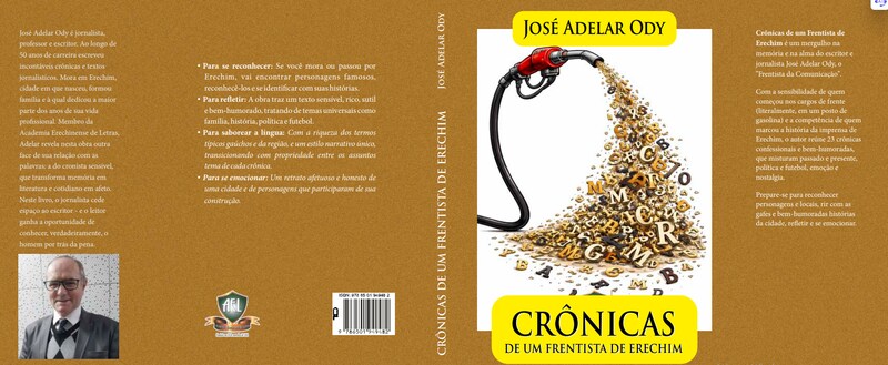 Crônicas de um Frentista de Erechim apresenta crônicas assinadas por José Adelar Ody, em 238 páginas. Com o selo da Academia Erechinense de Letras, a obra está disponível nos formatos impresso e e-book, e poderá ser adquirido durante a feira do livro no estande da AEL, onde o leitor poderá ter contato direto com o Autor. O e-book estará disponível na Amazon.
