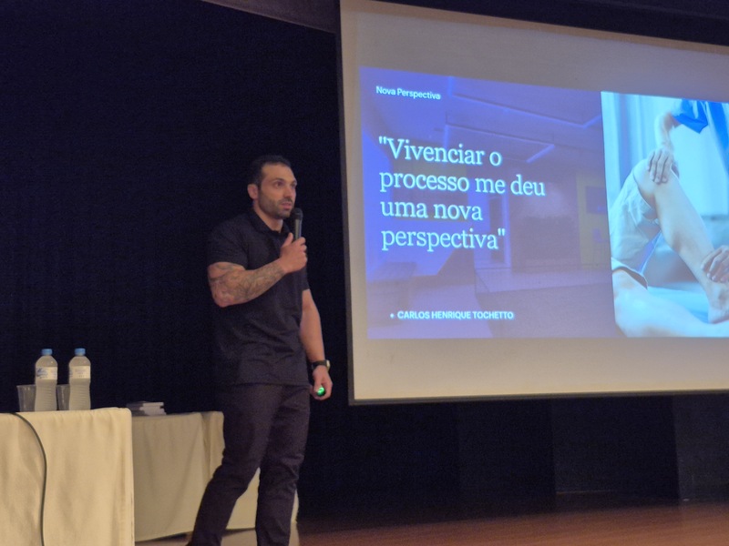 Na primeira palestra, o fisioterapeuta Carlos Henrique Toquetto, diplomado da 12ª turma do curso, compartilhou sua trajetória profissional, relembrando o início na graduação, em 2014, as dificuldades enfrentadas no percurso acadêmico e experiências na área esportiva, incluindo atuação no Ypiranga Futebol Clube. Destacou, entre outros aspectos, a persistência e a prática desde o início da graduação, a busca por conhecimento e a construção de conexões profissionais e a importância da interdisciplinaridade.