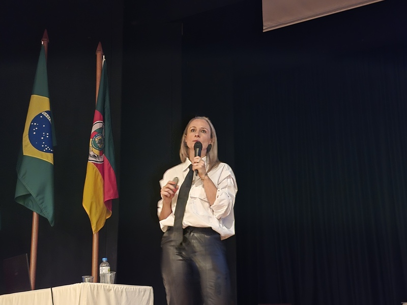 A segunda palestra foi conduzida pela fisioterapeuta e professora do curso, Karine Angélica Malysz, diplomada na primeira turma. Iniciou sua fala com uma dinâmica de reflexão com o objetivo de sentirem o papel do cuidado, da empatia e do acolhimento na prática profissional. A docente abordou também a trajetória na fisioterapia aquática, formações realizadas e experiências profissionais. Também trouxe reflexões sobre formação contínua, adaptação de técnicas e importância do olhar individualizado ao paciente.