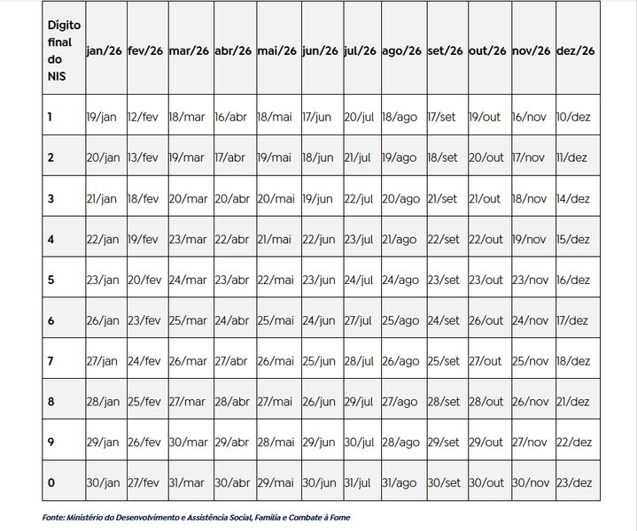 Os pagamentos ocorrerão nos últimos dez dias úteis de cada mês, de forma escalonada conforme o dígito final do Número de Inscrição Social (NIS), exceto em dezembro, quando o cronograma é antecipado em cerca de uma semana por causa do Natal.