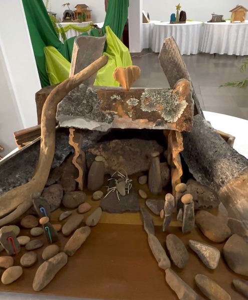 Entre os trabalhos, um em especial provoca reflexão pelo simbolismo que traz. Trata-se de um presépio confeccionado pelo próprio padre Clair, que decidiu transformar as marcas de duas tragédias recentes — a enchente do ano passado no Rio Grande do Sul e o temporal de granizo que destruiu casas em Erechim neste ano — em símbolos de fé e reconstrução. “As pedras que usei foram recolhidas de um rio que transbordou e invadiu casas da comunidade. As telhas encontrei nas ruas depois do granizo”, explica. O presépio conta com pedras que representam a enchente e fragmentos de telha que remetem ao temporal. Além de retratar pastores, animais e os magos, a composição traz um pequeno coração de pedra encontrado pelo padre às margens do rio. “A própria água lapidou esse coração. Para mim, ele mostra que, quando o amor se transforma em gesto e solidariedade, podemos reconstruir qualquer tragédia”, afirma.