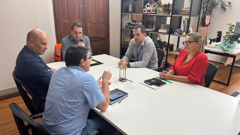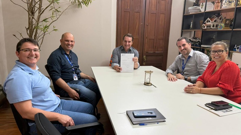 O prefeito Paulo Polis sancionou, nesta terça-feira (24), a Lei Municipal Nº 7.765/2026, que inclui a Corrida e Caminhada do SESI no Calendário Oficial de Eventos de Erechim. O ato foi realizado em agenda com o gestor do SESI, Álvaro Camilo Dias Faria; com o coordenador da área de Saúde, Rafael Moser; a analista de Promoção da Saúde, Cristiane Possamai e a vereadora proponente da lei, Clarice Moraes.