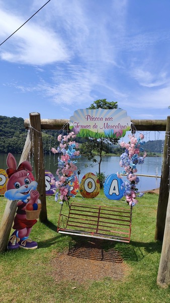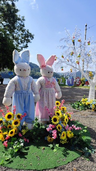 Praças e espaços públicos ganharam elementos temáticos que remetem à Páscoa, com coelhos, ovos decorativos e detalhes coloridos que chamam a atenção de quem passa pelos locais. Um dos destaques é a ornamentação instalada na orla das termas, área bastante frequentada por turistas e pela comunidade, que agora também recebe um toque especial para celebrar o período.