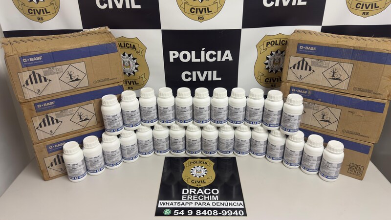 A Polícia Civil prendeu dois homens, de 42 e 43 anos, em flagrante por receptação de defensivos agrícolas no município de Tio Hugo, no final da tarde de quinta-feira (12). Os produtos haviam sido furtados de uma cooperativa em Erechim, em dezembro de 2025, e estavam sendo comercializados na região.