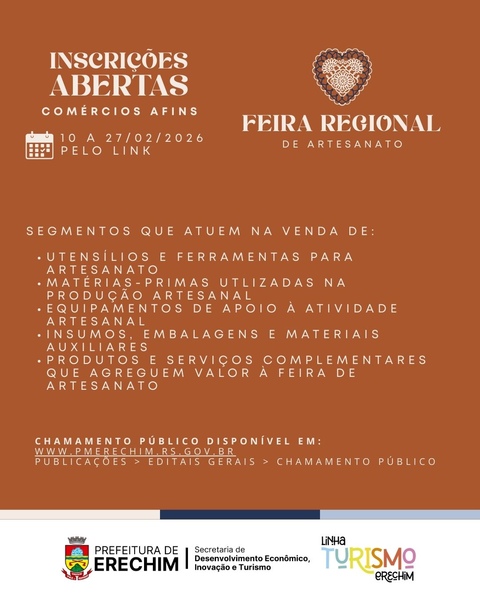 A Prefeitura de Erechim, por meio da Secretaria Municipal de Desenvolvimento Econômico, Inovação e Turismo, abriu as inscrições para o Chamamento Público Nº 006/2026, que visa ao credenciamento de comércios interessados em participar da 1ª Feira Regional de Artesanato do Norte do Estado do Rio Grande do Sul. O evento será realizado nos dias 13, 14 e 15 de março de 2026, no Parque da ACCIE, reunindo artesãos, empreendedores e fornecedores do setor.