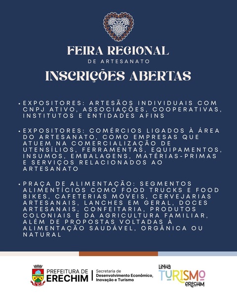 A Prefeitura de Erechim, por meio da Secretaria Municipal de Desenvolvimento Econômico, Inovação e Turismo, promove nos dias 13, 14 e 15 de março de 2026, no Parque da ACCIE, a 1ª Feira Regional de Artesanato do Norte do Estado do Rio Grande do Sul. Atualmente, são três Chamamentos Públicos para se inscrever e integrar o evento.