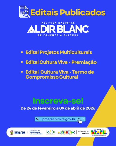 A Prefeitura de Erechim, através da Secretaria Municipal de Cultura, Esporte e Economia Criativa, está com inscrições abertas para três editais municipais da Política Nacional Aldir Blanc de Fomento à Cultura (PNAB), que destinarão recursos significativos para o fortalecimento das iniciativas culturais no município. Ao todo, são 26 vagas distribuídas entre projetos culturais, premiação de Pontos de Cultura e fomento a projetos continuados de Pontos de Cultura, contemplando diferentes perfis de agentes culturais e organizações. As diretrizes e temas dos editais foram definidos pelo Ministério da Cultura para orientar Estados e Municípios na criação dos editais locais do ciclo. O prazo de inscrições é de 24 de fevereiro até 9 de abril de 2026.
