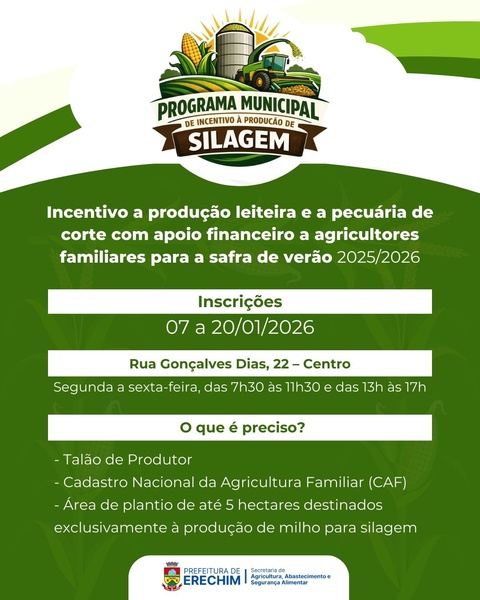 A Prefeitura de Erechim, por meio da Secretaria Municipal de Agricultura, Abastecimento e Segurança Alimentar, definiu de 7 a 20 de janeiro de 2026, o período de inscrições para produtores interessados em aderir ao Programa Municipal de Incentivo à Produção de Silagem, instituído pela Lei Nº 7.742, fortalecendo a produção leiteira e a pecuária de corte no município, com apoio financeiro a agricultores familiares para a safra 2025/2026.