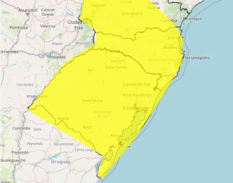 Divulgado às 10h desta segunda-feira (16), o principal aviso é de nível laranja, que representa situação de perigo. O alerta abrange praticamente todo o território gaúcho, incluindo Fronteira Oeste, Serra, Norte, Noroeste, Nordeste, Sudeste, região Central e a Região Metropolitana de Porto Alegre, com validade até terça-feira (17).