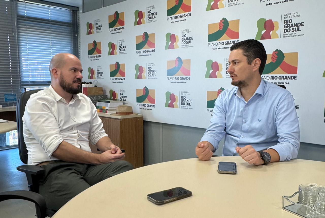 Em outro momento, Marcelo esteve com o secretário da Reconstrução do RS, Pedro Capeluppi, apresentando demandas de reconstrução de municípios atingidos por enchentes e outros desastres naturais.