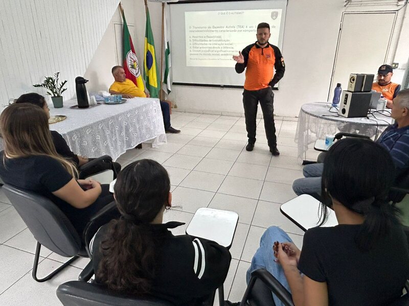 Nesta terça-feira (7), 14 motoristas da Secretaria Municipal de Educação e 16 monitores do Transporte Escolar participaram, de um importante treinamento voltado ao Transtorno do Espectro Autista (TEA). A capacitação foi ministrada pela equipe da Força Voluntária do Alto Uruguai, sob a condução do instrutor Acácio Rodrigo Mentz, profissional habilitado para atuação em emergências envolvendo pessoas com autismo; com apoio da Defesa Civil, atrelada a Secretaria Municipal de Gestão e Governança; e da Escola de Gestão, atrelada a Secretaria Municipal de Administração