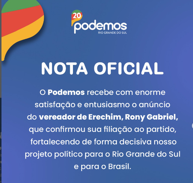 O Podemos anunciou, por meio de nota oficial assinada pelo presidente estadual Everton Braz, a filiação do vereador de Erechim Rony Gabriel ao partido. Segundo o texto, a chegada do parlamentar é vista como um reforço estratégico para o projeto político da sigla no Rio Grande do Sul e no cenário nacional.