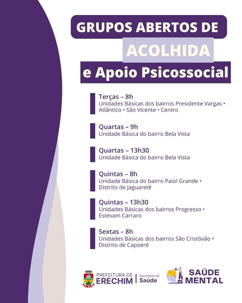 A partir desta semana, todas as Unidades Básicas de Saúde passam a promover Grupos Abertos de Acolhida e Apoio Psicossocial, conduzidos pelas psicólogas da Atenção Primária. Os encontros são gratuitos, abertos e sem necessidade de agendamento.