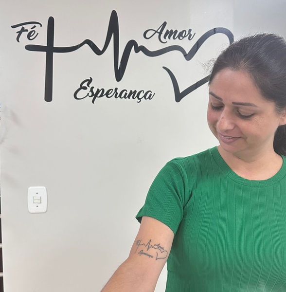 A jornada, no entanto, foi construída dia após dia, com apoio e esperança. Uma imagem na sala de espera da oncologia — com corações, batimentos e as palavras “fé, esperança e amor” — se tornou um verdadeiro guia emocional. Inspirados por ela, a amiga Gláucia Ertal e o esposo Cleomar fizeram uma promessa: eternizar aquele símbolo na pele quando a vitória chegasse. E ela chegou. A tatuagem agora é mais do que um desenho — é a marca viva de uma batalha vencida.